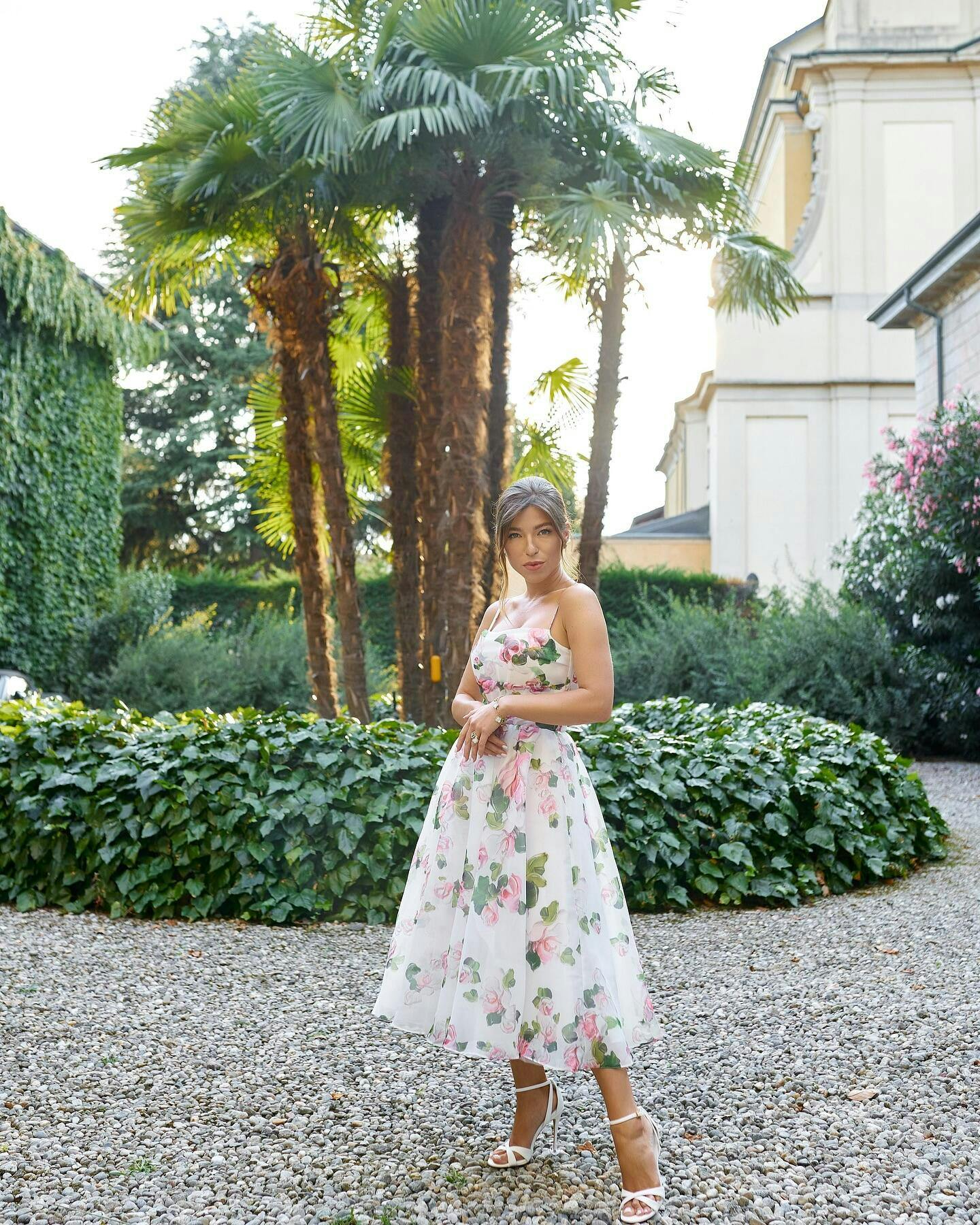 Delicate spaghetti strap dress with a midi-length puffy skirt. Featuring flared skirt, and a fit ruched bodice with a lace on the back. The dress is designed in a floral print.