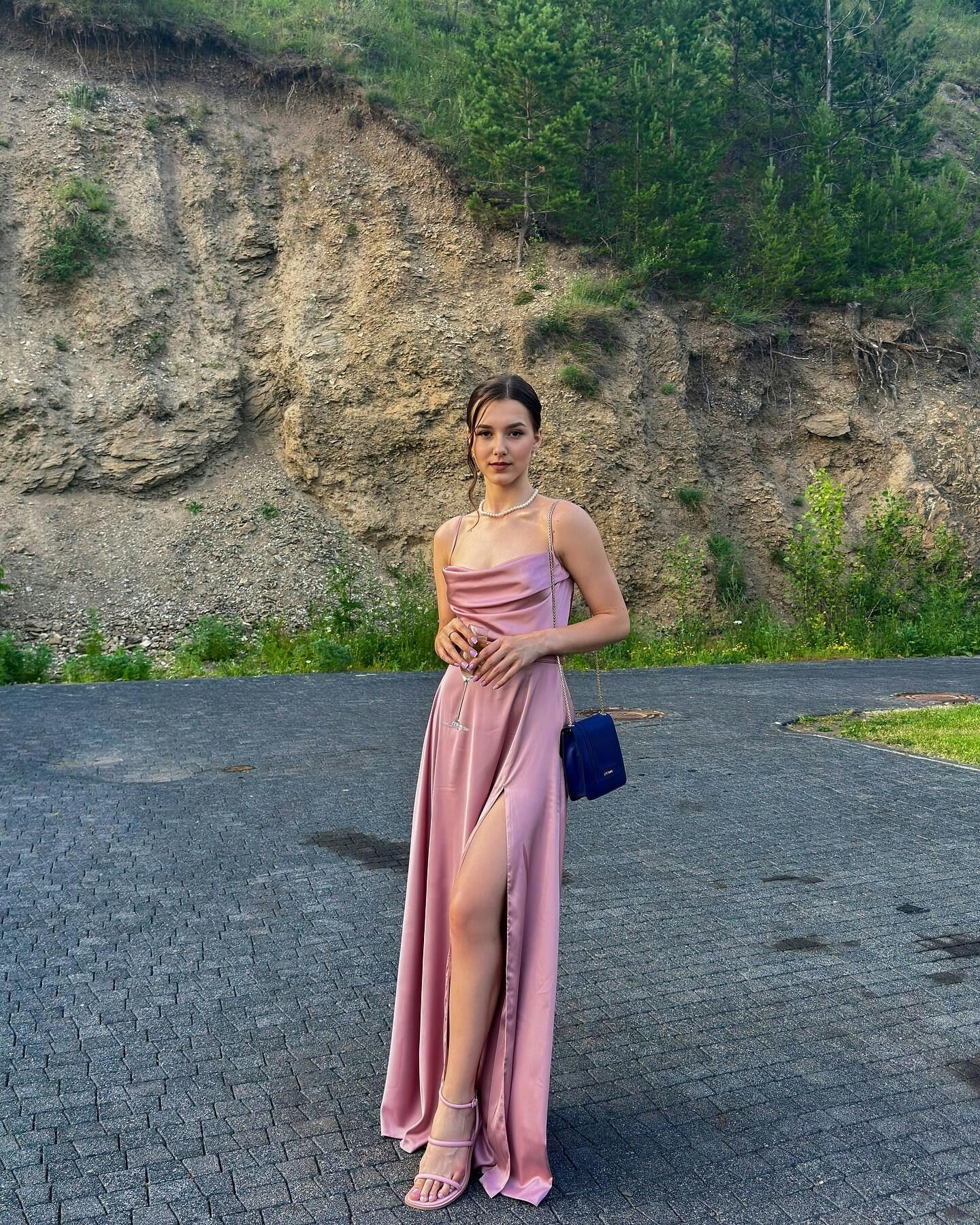 Maxi silk slip-style dress in a misty rose color. Featuring a flowing silhouette with a layered neckline, thin spaghetti straps, a maxi skirt with a high side slit, and a deep open back tied crosswise on the waist.