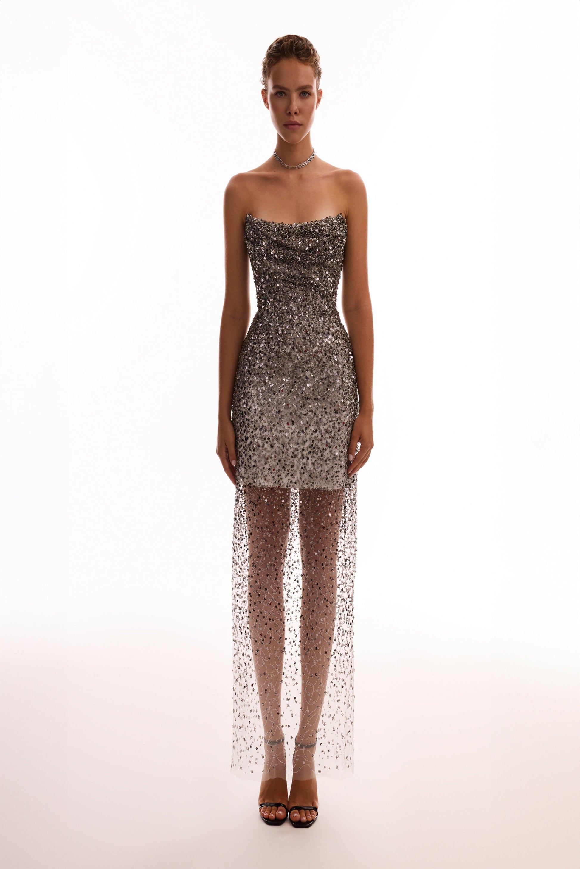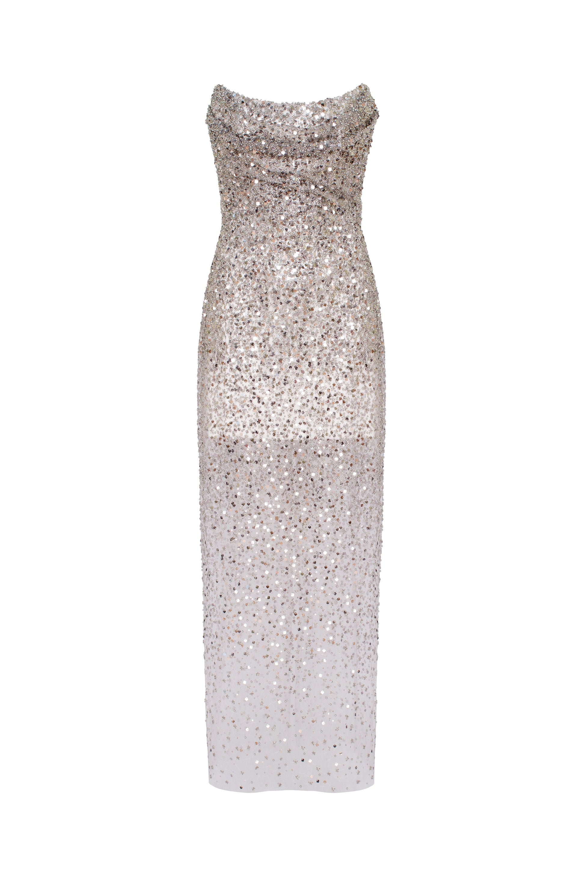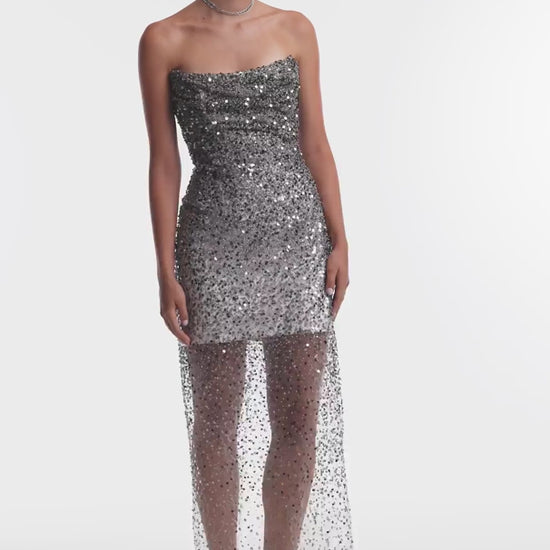 Stunning semi-sheer strapless silver sequined maxi dress. Featuring a geometric neckline and fitted bodice with a corset closure to highlight your curves. A white lining underneath the dress creates a stunning gradient from deep to light silver offering a subtle yet impactful visual effect. Perfect for formal events, this dress offers a blend of elegance and statement-making style.