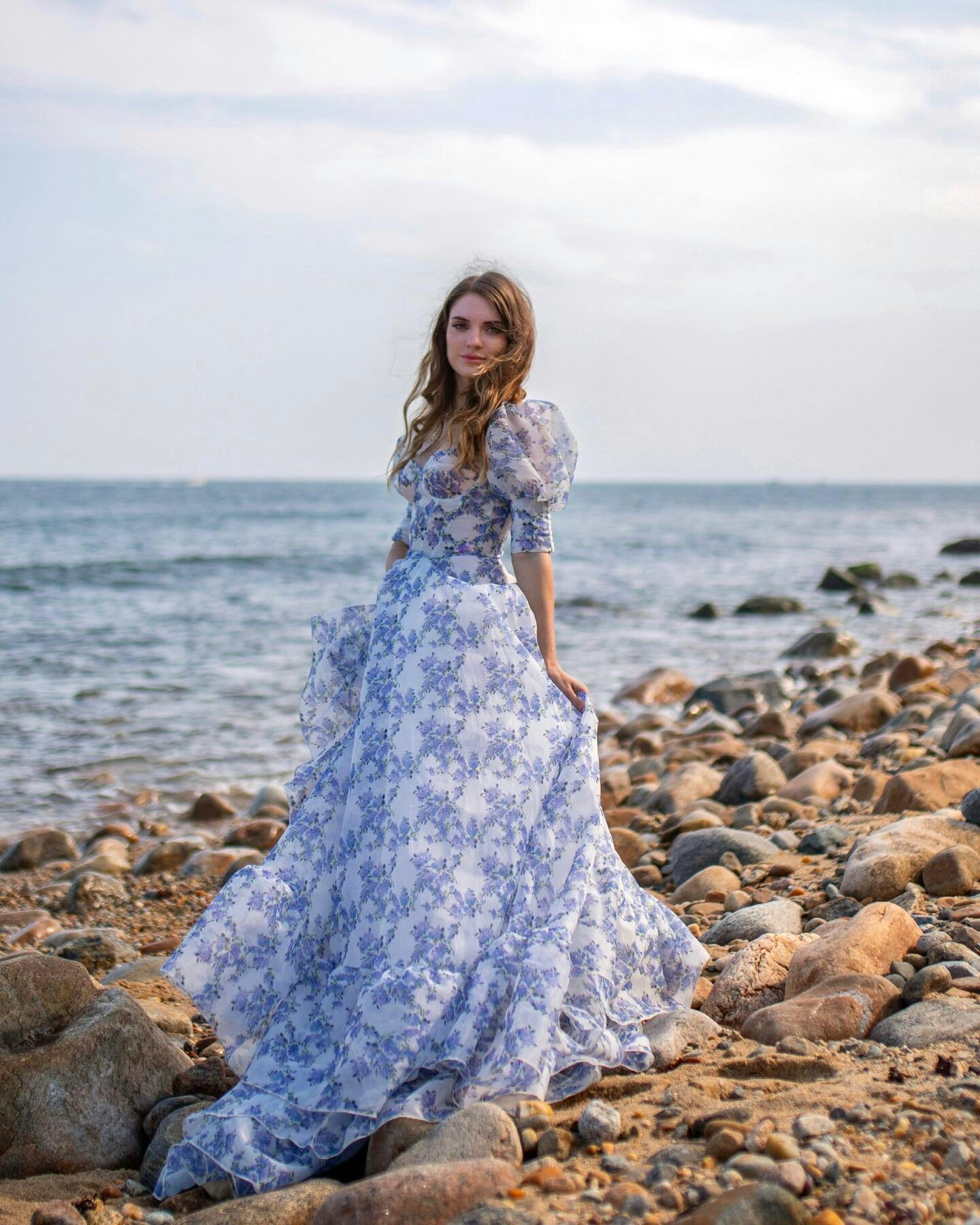 This dress and the sea were made for each other. The sheer sleeves moved with the wind like sails, and the hydrangea print glowed against the water. Every picture looked like it belonged on a postcard.