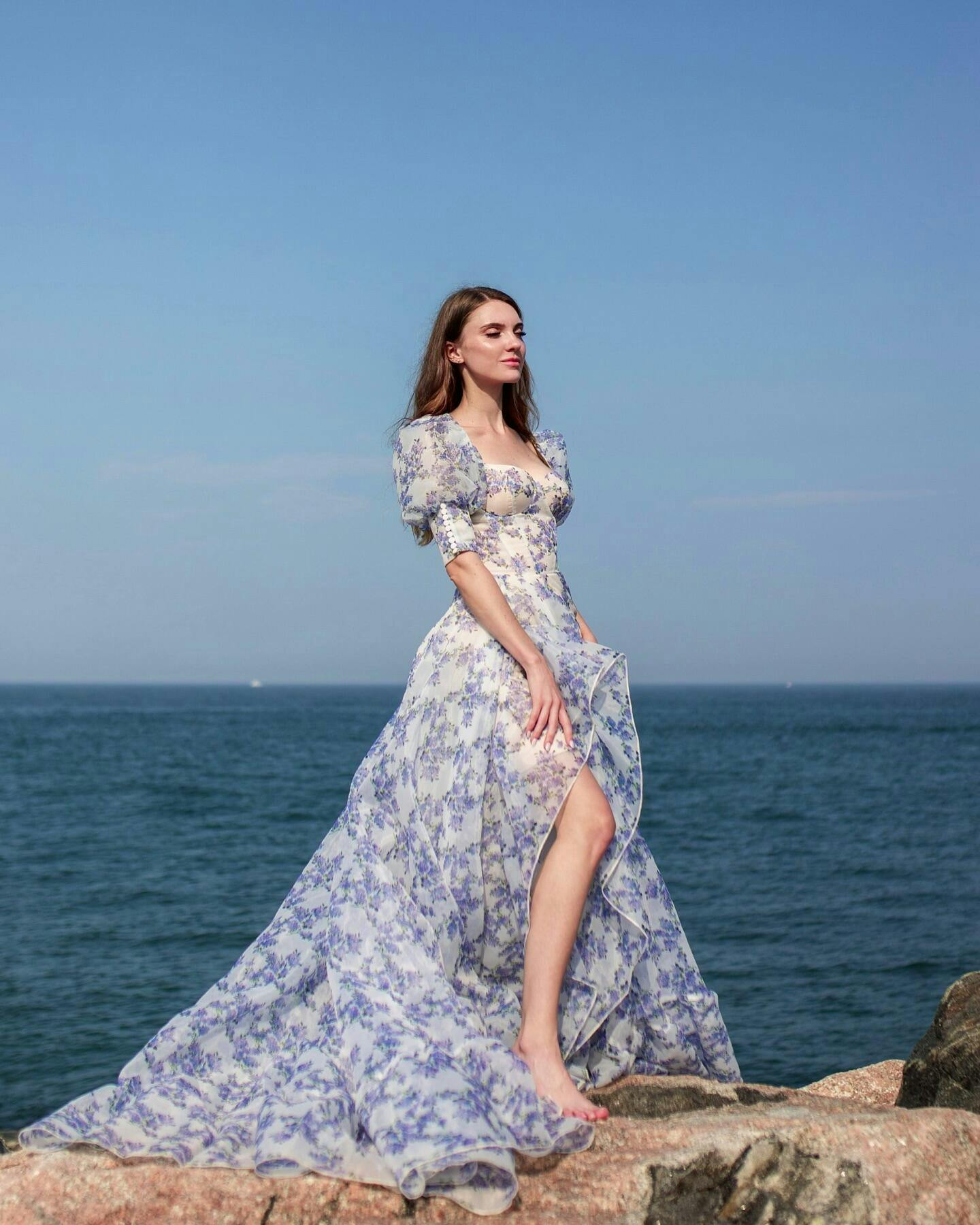 Elegant floral puff sleeve dress is a floor maxi long length, designed with a heart-shaped neckline. The gown has an off-the-shoulder bustier top and puffy semi-transparent sleeves. The skirt of the dress has a front slit and a long train.
